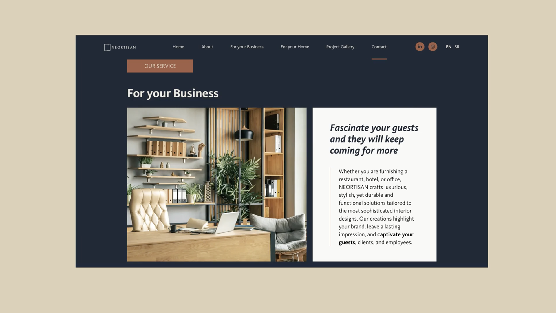 Although a newly established brand, one of the key goals was to present Neortisan as a reliable and professional partner — grounded in decades of hands-on experience. Behind the brand stands a team of interior designers and furniture craftsmen with over 20 years of practice in custom furniture production and project execution.